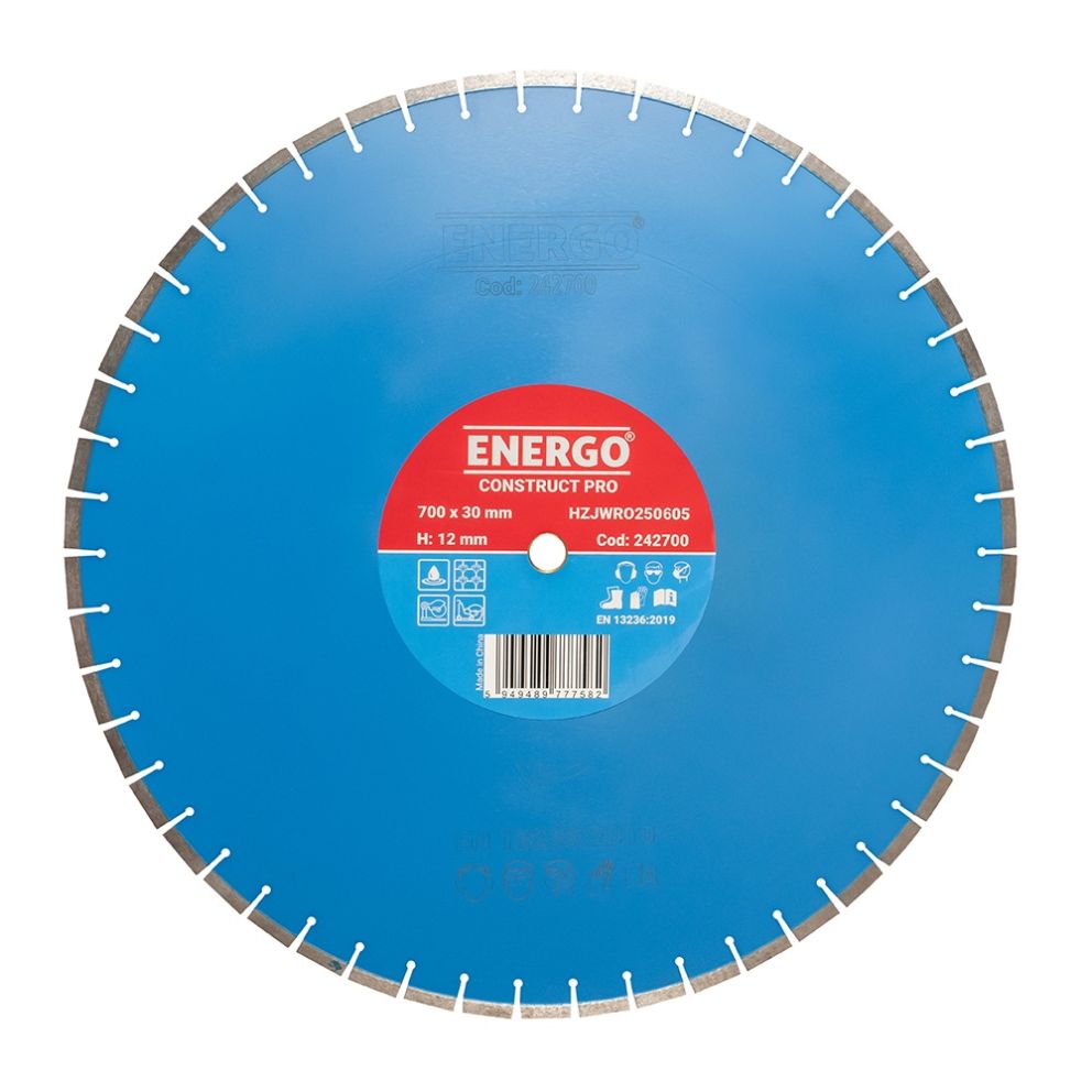 | Caracteristici suplimentare | Inaltimea sectorului diamantat: 12.0 mm Mod de utilizare: utilizare umeda Recomandat pentru utilaj: masina mobila de taiat beton/asfalt cu motor termic sau electric mese de debitat placi/dale/blocuri cu cap taiere deasupra pe sine de glisare |