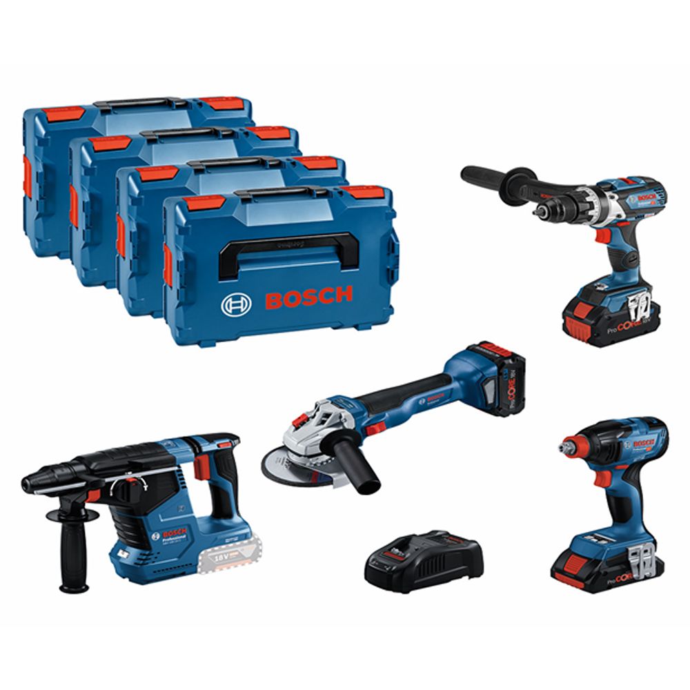 | Setul de livrare | Scule incluse in set: Masina insurubat/gaurit cuplu reglabil cu acumulator GSR18V-110C Cheie cu impact cu acumulator GDX18V-210C Polizor unghiular cu acumulator GWS18V-10 Rotopercutor cu acumulator GBH18V-24C Acumulatori si statie incluse in set: 2-acumulatori 5.5 Ah ProCORE 1-acumulator 4.0 Ah ProCORE Incarcator Cutii de transport/ depozitare incluse: 4xValize plastic |