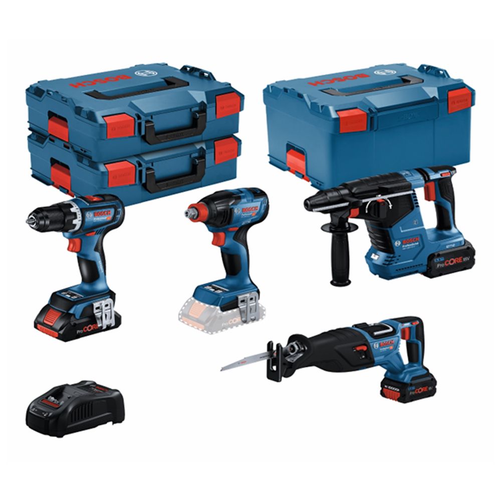 | Setul de livrare | Scule incluse in set: Masina insurubat/gaurit cuplu reglabil cu acumulator GSR18V-90C Cheie cu impact cu acumulator GDX18V-210 Rotopercutor cu acumulator GBH18V-24C Fierastrau sabie cu acumulator GSA18V-28 Acumulatori si statie incluse in set: 2-acumulatori 5.5 Ah ProCORE 1-acumulator 4.0 Ah ProCORE Incarcator Cutii de transport/ depozitare incluse: 3xValize plastic |