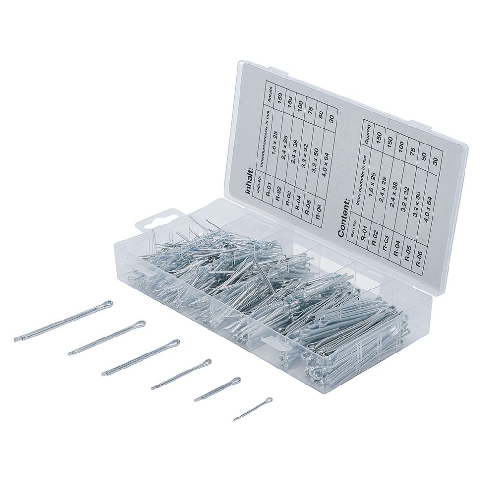 | Setul de livrare | Cutie plastic Splinturi de siguranta cu marimile: 150 buc - 1.6x25 mm 150 buc - 2.4x25 mm 100 buc - 2.4x38 mm 75 buc - 3.2x32 mm 50 buc - 3.2x50 mm 30 buc - 4.0x64 mm |